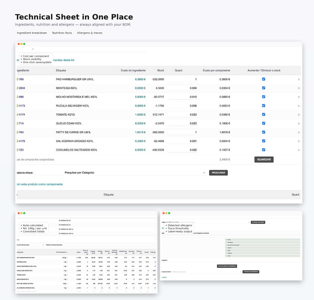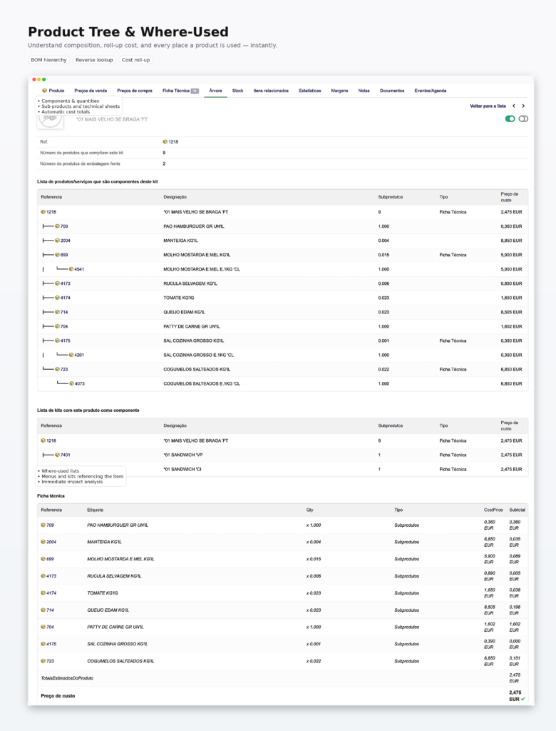 - Reverse view (where used): list of kits/technical sheets and menus where the item is used as a component, enabling the impact analysis of cost changes, substitutions, and raw-material normalization.